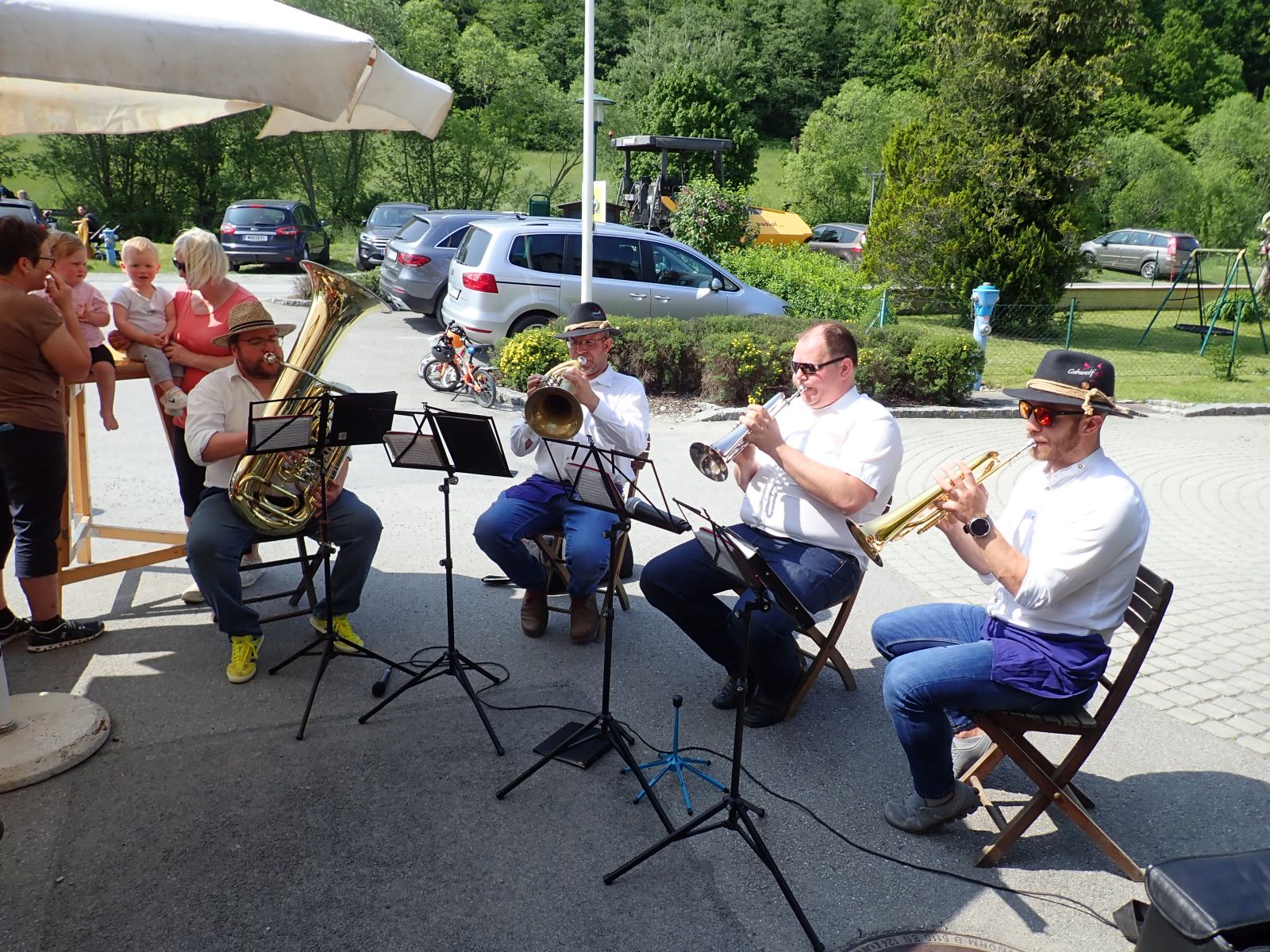 Die Wanderstrecke führte vom Feuerwehrhaus über den Kurpark auf dem Hohlweg Richtung Hutwisch bis zur Abzweigung nach Almen/Wenigreith weiter nach Schützenkasten, wo an der ersten Labestelle bei Familie Hetlinger/Heissenberger („Wolfsbauer“) eine verdiente Rast bei Grillspeisen, Aufstrichen und Getränken eingelegt werden konnte. Der weitere Streckenverlauf erfolgte durch den Wald über „Ortbauer-Steinbruch“ zur Familie Konlechner, wo die zweite Labestelle für die durstigen und hungrigen Wanderer eingerichtet wurde. Über Maierhöfen und den Hohlweg/Augasse ging es wieder zurück zum Ziel im Feuerwehrhaus. Hier erfolgte die Verpflegung auch mit Schnitzel, Salat und Pommes – dieses Angebot wurde wie in vergangenen Jahren auch von Nichtwanderern gerne angenommen. Ab 15.00 Uhr spielte „Quadra Buckliga“ zum Kurkonzert auf. Der Dorfwandertag 2023 fand erst in den späten Abendstunden sein Ende.