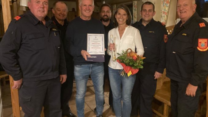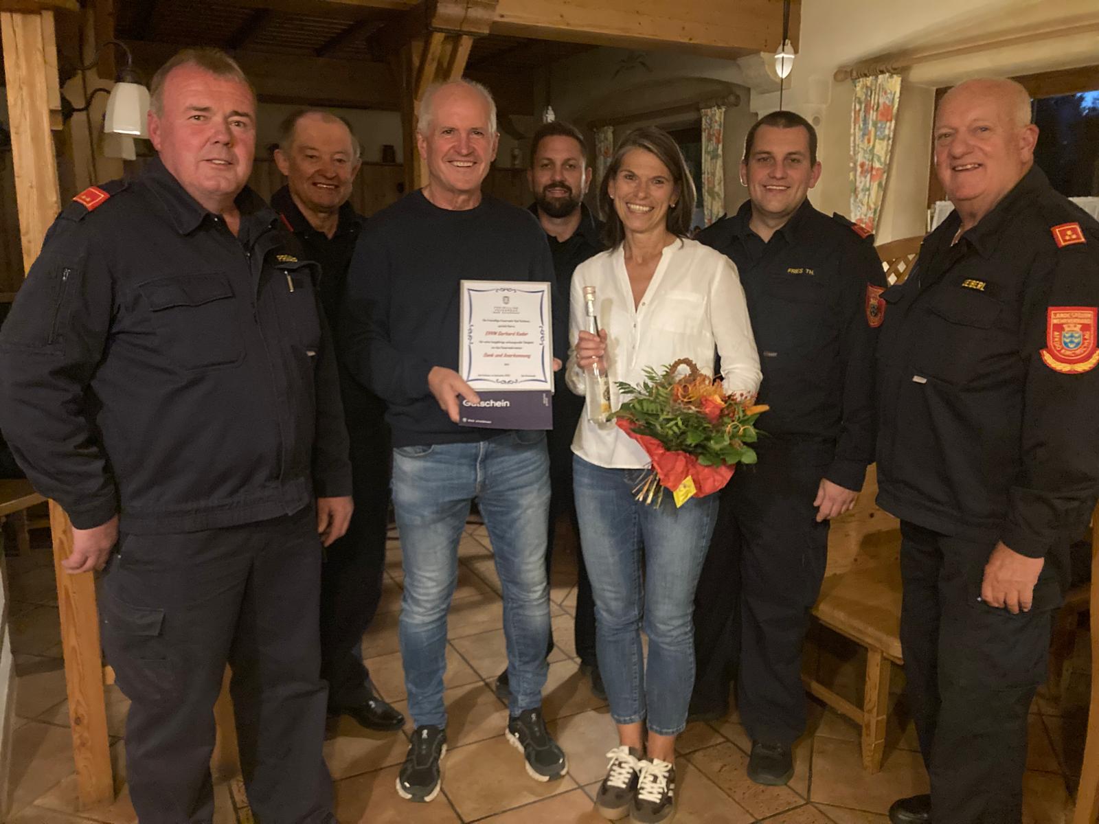 Im Bild von links nach rechts, Kommandant OBI Martin Piribauer, EV Erich Riegler, EHVM Gerhard Koder, V Jürgen Hetlinger, Birgit Koder, Kommandant Stv. BI Thomas Fries und EHBI Herbert Seiberl gratulierten EHVM Gerhard Koder zum 65. Geburtstag.