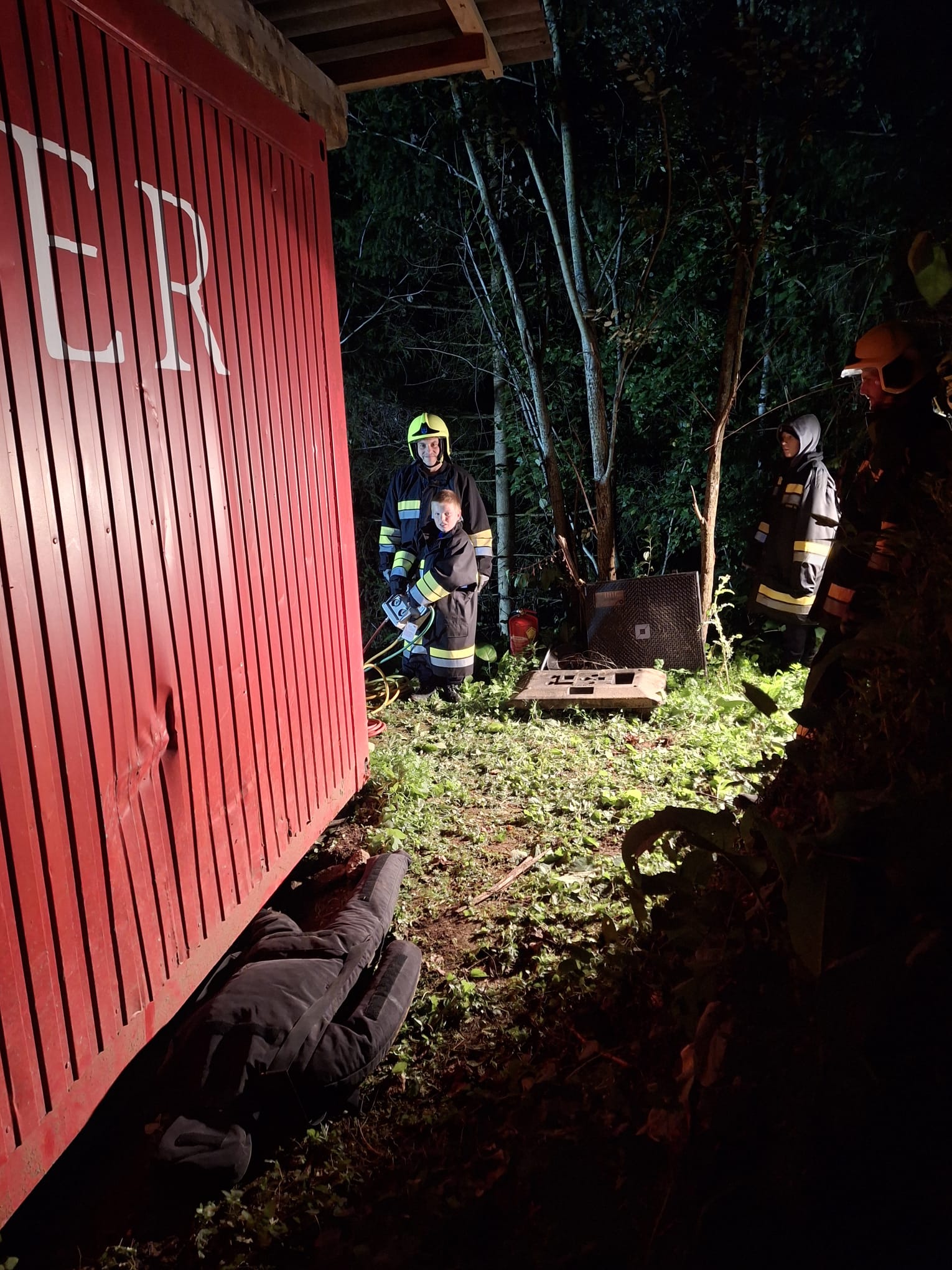Dabei galt es eine unter einem Container eingekelmmte Person zu retten. Der Container wurde mittels Hebekissen angehoben und gesichert, dann konnte die eingeklemmte Person gerettet werden.