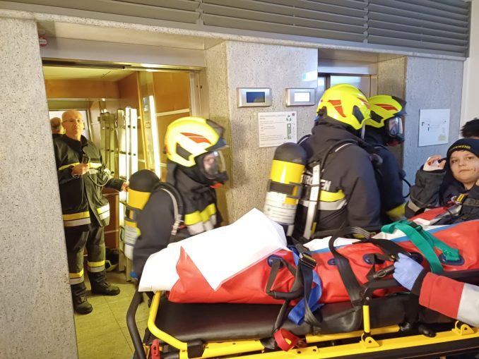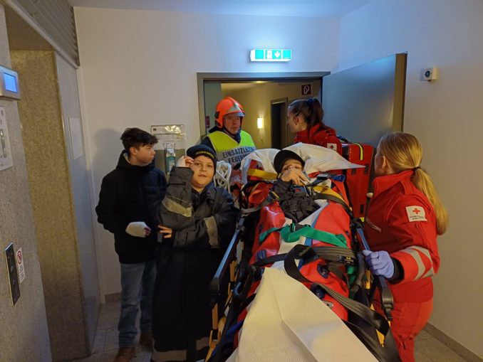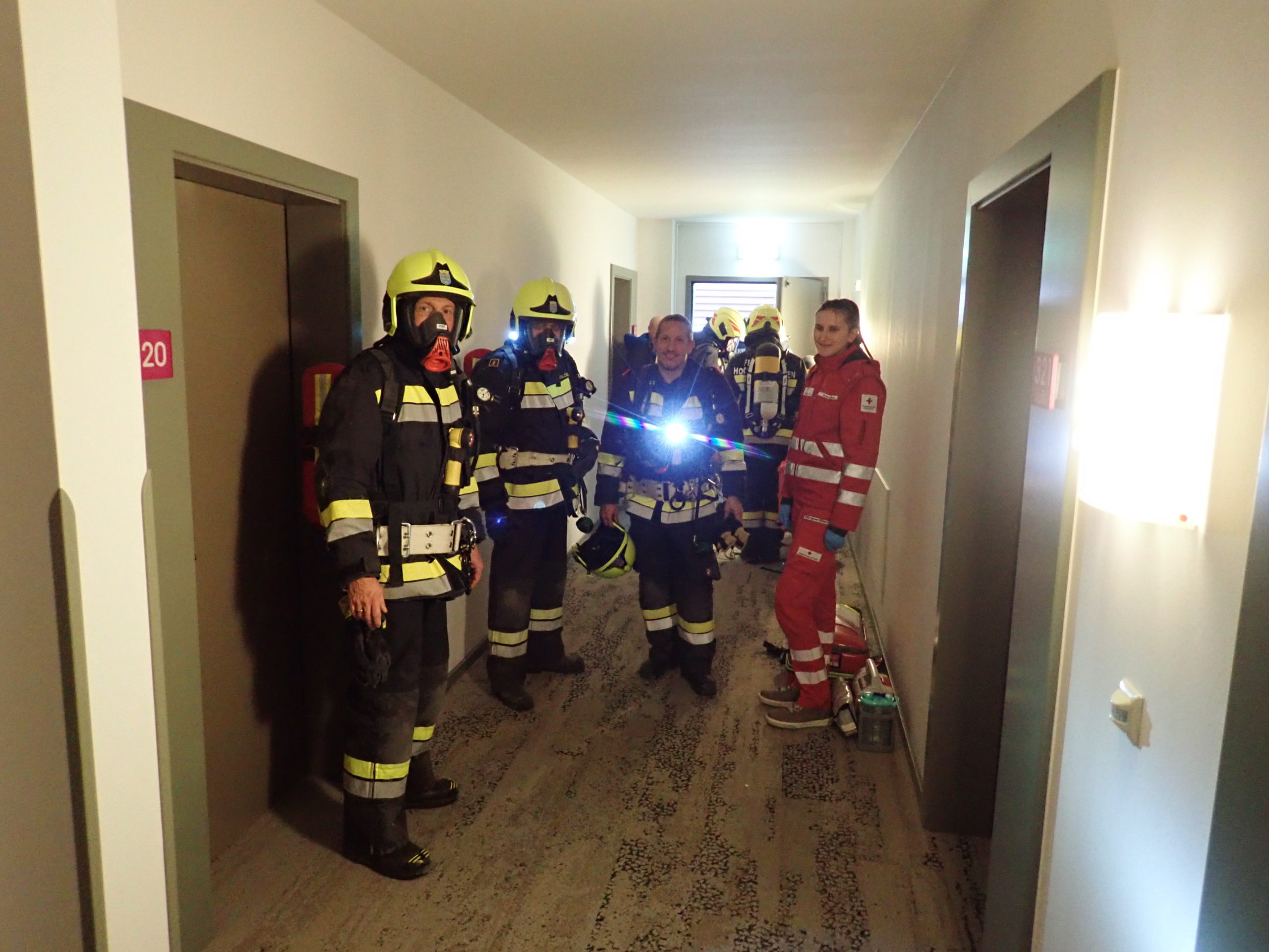 Zur Unterstützung der Feuerwehren wurde auch das Rote Kreuz Kirchschlag alarmiert. Die Sanitäter übernahmen an der Sammelstelle und im 3. OG im gesicherten Bereich die Erstversorgung der Geretteten und standen für weitere medizinische Maßnahmen bereit.
