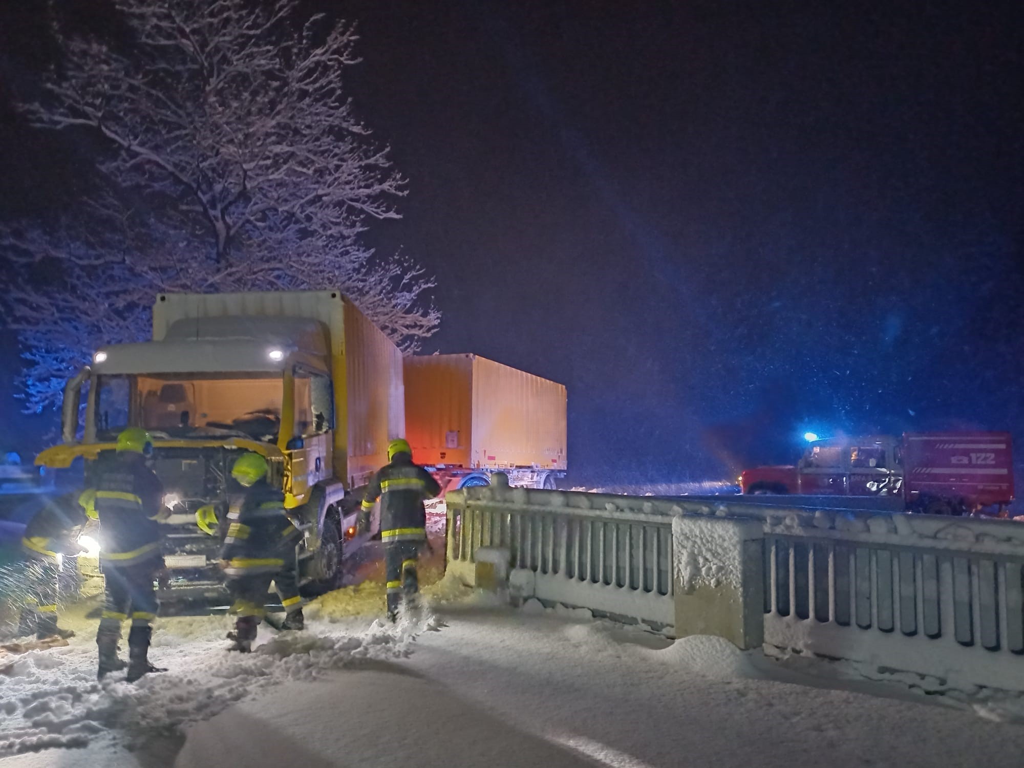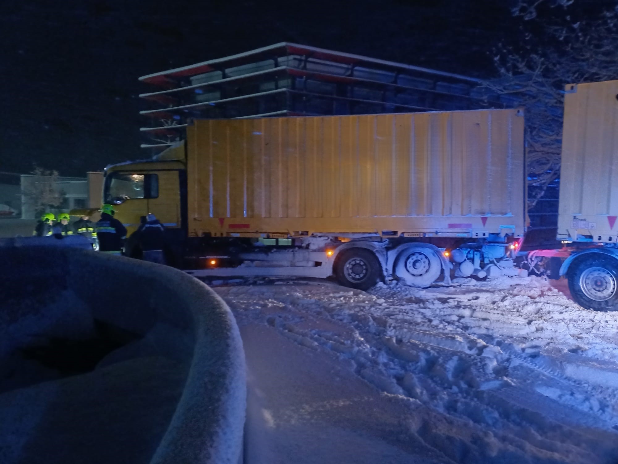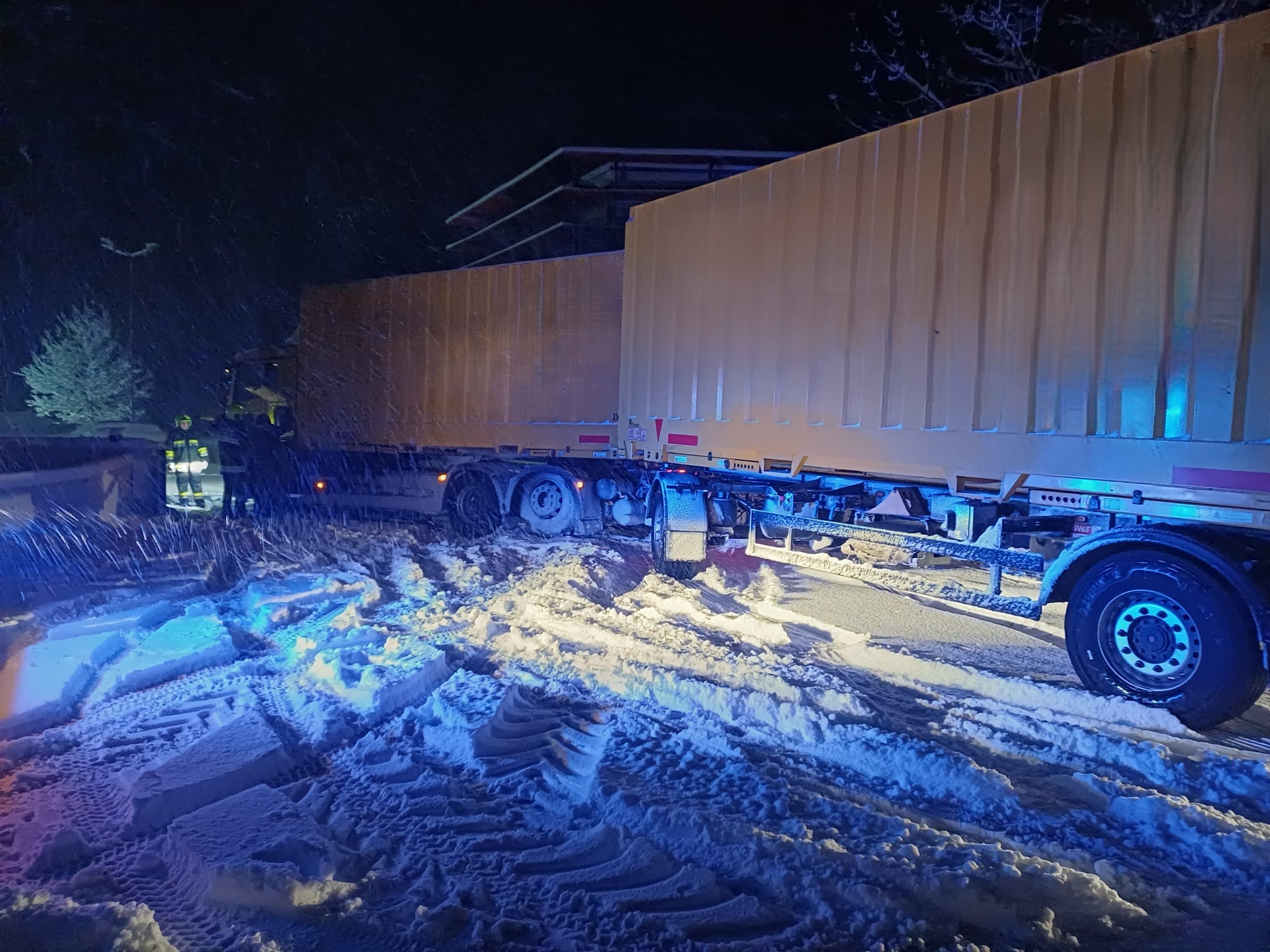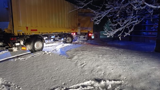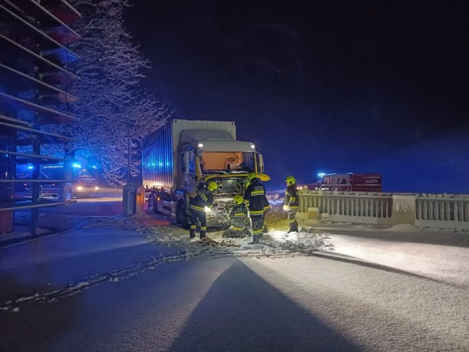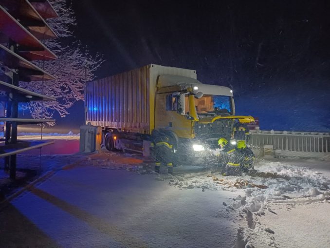 Beim Abbiegen auf das Firmengelände rutschte ein Lastwagen mit Anhänger auf der Brücke Richtung Bach. Der Lenker schaffte es auf der Brücke stehen zu bleiben, konnte dann aber aufgrund des Schnees nicht mehr eigenständig losfahren.